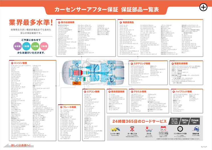 保証範囲は業界最多水準の350項目です。ハイブリット機構やエンジン機構に加え、自動ブレーキなどの先進機構も保証します。